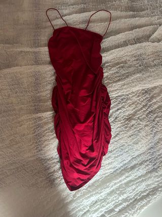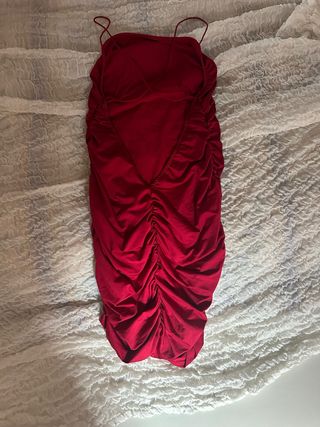 Elegante vestito rosso con dettagli drappeggiati. - Scollatura sulla schiena. - Tessuto morbido e confortevole. - Design aderente che valorizza la figura.