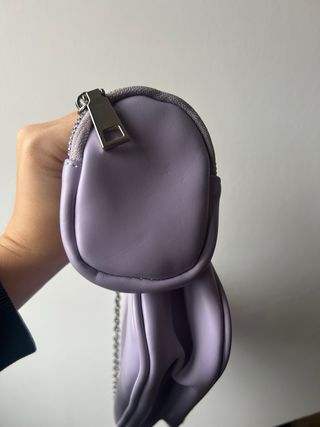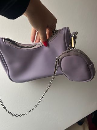 Borsa a tracolla viola con un piccolo portamonete abbinato, perfetto per portare con te l'essenziale. - Materiale similpelle. - Dettagli con zip. - Catena metallica come tracolla.