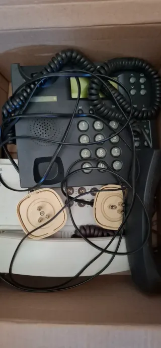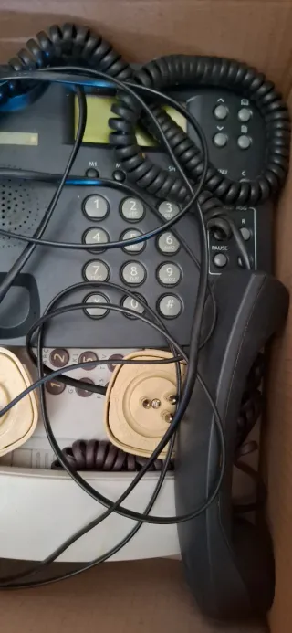 Telefono fisso con cavo a spirale. Prezzo CADAUNO - Colore principale beige con dettagli neri. - Tastiera numerica. - Ricevitore con cavo. - Display. - Due connettori per cavi.