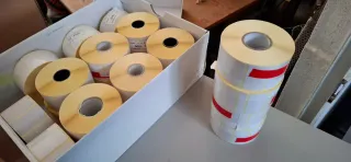 Rotoli di etichette termiche, ideali per stampanti. Cadauno 2 euro - Quantità: 2000 etichette. - Colore: Bianco con banda rossa.