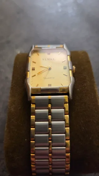 Orologio vintage anni 80 Vi.Max al quarzo. Pezzo NOS fondo di magazzino. Perfettamente funzionante e mai indossato con ancora etichetta dell'epoca con prezzo in lire. Sul 3, 6, 9 e 12 ha dei punti luce che lo rendono molto elegante. Cinturino in acciaio color oro e argento. Sia per LUI CHE PER LEI.