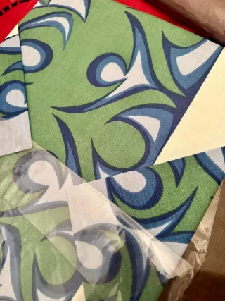 Elegante tovaglia rettangolare con un motivo astratto nei toni del blu e del verde. Perfetta per ospitare fino a 6 persone. - Include 6 tovaglioli coordinati. - Realizzata in tessuto di qualità, misto lino