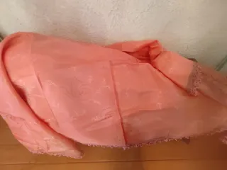 Elegante copriletto matrimoniale in tessuto damascato, con un tocco vintage. Il disegno floreale aggiunge un dettaglio raffinato. - Motivo damascato con fiori e volute. - Bordi rifiniti con un pizzo delicato. - Trama lucida che riflette la luce.
