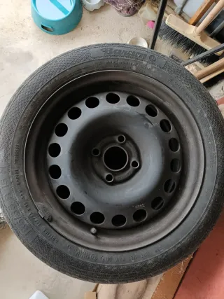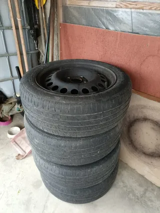 Set di 5 cerchi in ferro, compreso quello della ruota di scorta. Gomme usurate. Non consiglio l'uso. - Diametro 15 pollici. - Adatti per auto. - Condizioni come da foto.