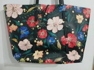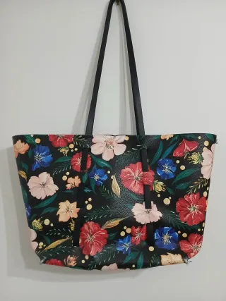 Borsa a tracolla Zara basic collection con una vivace stampa floreale su sfondo nero. Le maniche sono nere e resistenti. - Stampa floreale multicolore - Manici neri - Misure 50x30 p13 lunghezza Manici 38cm