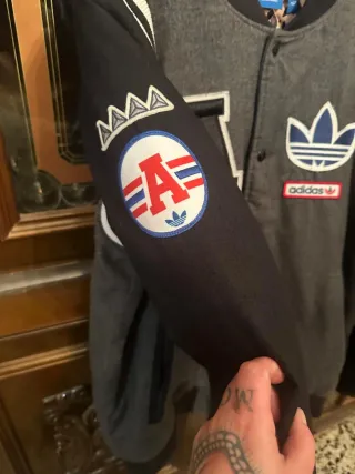 Bellissimo giubbino in stile college firmato Adidas. - Maniche in contrasto. - Patch A sul petto. - Logo Adidas sul petto. - Fodera interna con stampa animalier. Usato pochissimo nessun difetto o imperfezione