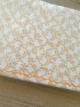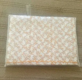 Set di lenzuola matrimoniali in puro cotone con un delicato motivo floreale. Contiene lenzuolo sotto, sopra e 2 federe - Fantasia floreale su sfondo bianco. - Bordatura decorativa arancione con motivo a onda.