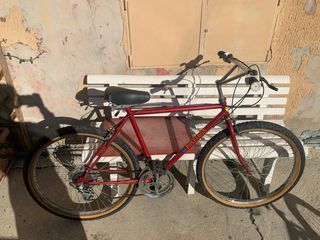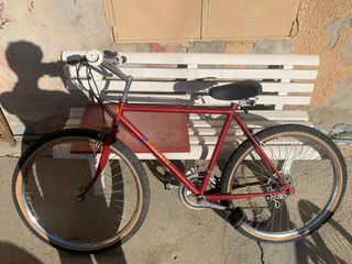 Bicicletta da uomo di colore rosso. - Telaio in metallo. - Manubrio con impugnature bianche. - Sella nera. - Ruote con cerchi argentati e copertoni color sabbia. Prezzo trattabile.