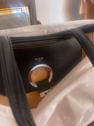 Borsa Guess con dettagli in pelle. - Logo Guess 1981. - Dettaglio ad anello in metallo. - Combinazione di colori beige e nero.