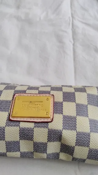 Pochette Louis Vuitton con tracolla, perfetta per ogni occasione. Il design a scacchiera la rende unica. - Motivo a scacchiera beige e grigio. - Tracolla regolabile. - Dettagli dorati.