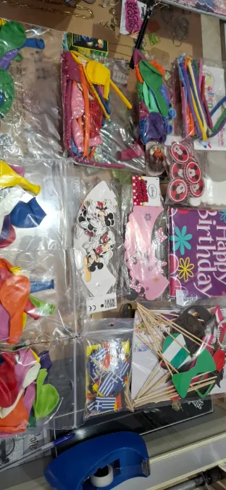 Lotto di articoli per feste di compleanno. - Palloncini colorati. - Decorazioni a tema Topolino. - Stuzzicadenti con bandierine. - Cappellini per feste.