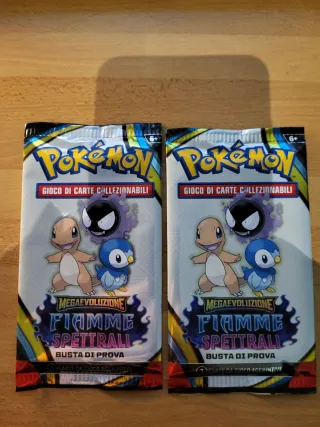 Due buste di prova per il gioco di carte collezionabili Pokémon. - Megaevoluzione Fiamme Spettrali - Contiene carte aggiuntive.