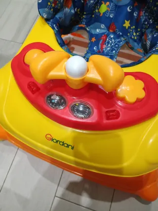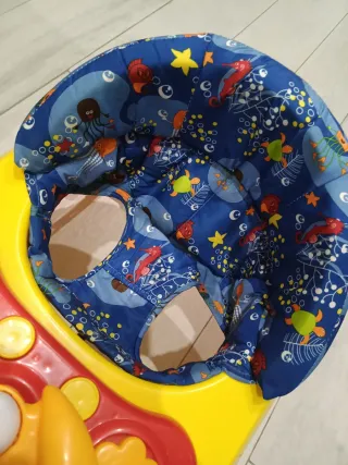 Girello per bambini con una divertente fantasia marina. Il tessuto è blu con disegni di pesci, meduse, stelle marine e cavallucci marini. - Tessuto imbottito per il comfort del bambino. - Design colorato e accattivante.