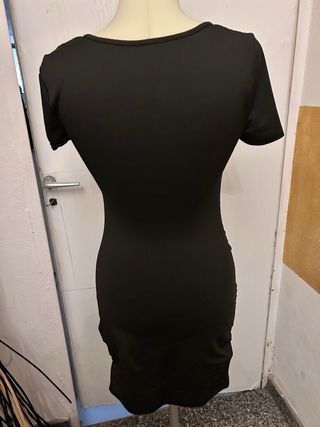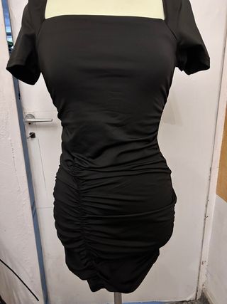 Elegante vestito tubino con dettagli a balze. veste un po grande - Scollo quadrato. - Maniche corte. - Tessuto elasticizzato. - Effetto drappeggiato sul fianco.