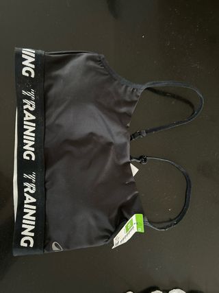 Top sportivo nero con dettagli a contrasto. TAGLIA XS - Fascia elastica con logo TRAINING. - Spalline sottili regolabili. - Tessuto morbido e traspirante.