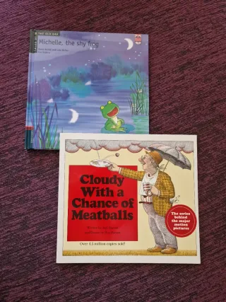 Ideale per praticare l'inglese a casa in modo divertente! Vendo un pacchetto di 2 racconti per bambini in inglese, molto visivi e divertenti. Età consigliata dai 4 agli 8 anni. Cloudy With a Chance of Meatballs: un bestseller mondiale (quello del film). Copertina flessibile. Michelle, the shy frog: della collezione 'Tales of the Old Oak' (Edelvives). Copertina rigida. Perfetto per i primi passi con la lingua. Molto ben curati, come nuovi. Fogli puliti e copertine perfette. Solo spedizione tramite Inpost.