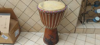 Tamburo etnico africano di circa 1 metro di altezza. Realizzato in legno con finiture in pelle e corde. - Altezza approssimativa: 1 metro. - Materiale: Legno e pelle. - Decorazioni con corde colorate.