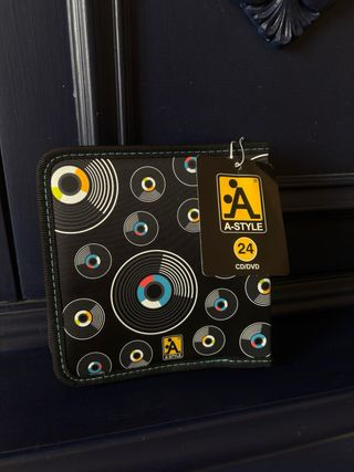 Pratico porta CD/DVD con un divertente design ispirato ai dischi in vinile. Perfetto per organizzare la tua collezione. - Design a tema dischi in vinile. - Chiusura con cerniera. - Patch A-STYLE applicata sul fronte.