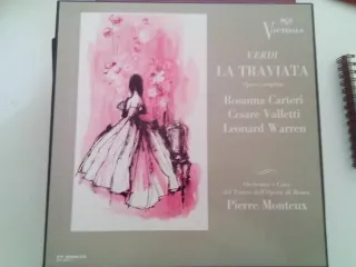 Cofanetto di dischi in vinile dell'opera La Traviata di Verdi. - Etichetta: RCA Victrola - Opera completa - Direttore: Pierre Monteux - Orchestra e Coro del Teatro dell'Opera di Roma - Cantanti: Rosanna Carteri, Cesare Valletti, Leonard Warren - Codice: KV 6604 (2)