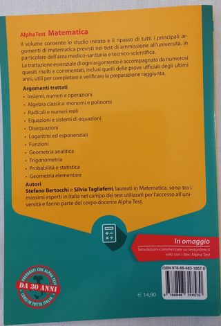 Alpha Test Matematica per i Test di Ammissione all'Università. Teoria, Schemi, Tabelle, Quesiti, Test di Verifica. Formato cm 14,8 x 21. Come Nuovo in perfette condizioni.
