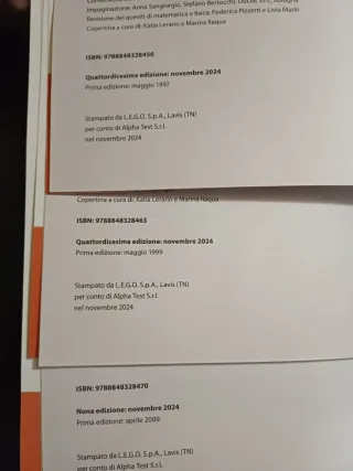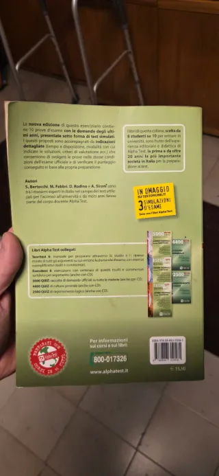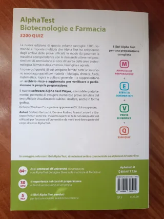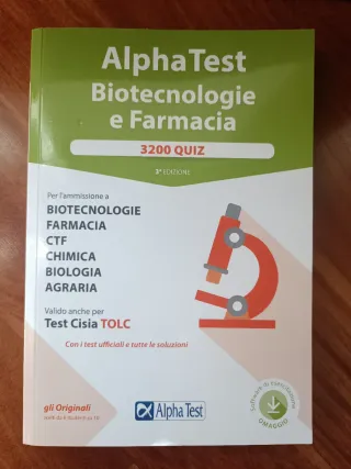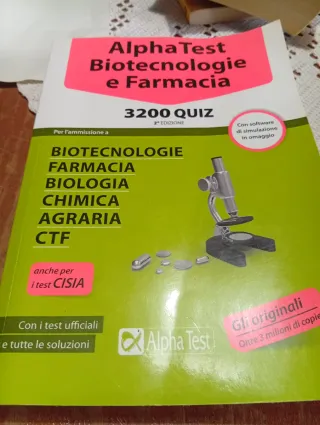 Alpha Test – Biotecnologie e Farmacia (TOLC-B, TOLC-F, TOLC-S) 5ª edizione – Manuale di preparazione Vendo manuale Alpha Test Biotecnologie e Farmacia, valido per TOLC-B, TOLC-F e TOLC-S (utilizzabile anche per TOLC-AV). 🔹 Condizioni: Usato solo per meno di un mese Utilizzato esclusivamente per superare il TOLC-S Ottime condizioni, pari al nuovo Nessun segno, nessuna piegatura, nessuna pagina rovinata 🔹 Contenuti: Manuale completo per la preparazione ai test di ammissione in Biotecnologie, Farmacia, CTF, Chimica, Biologia e Agraria, con teoria chiara ed esercizi mirati. 💰 prezzo TRATTABILE .