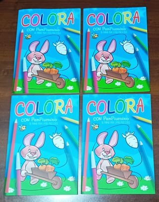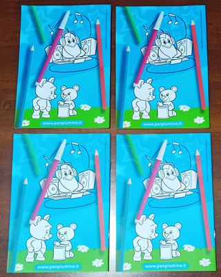 Set di quattro quadernini creati dall'azienda PanPiumino, con tante simpatiche immagini da colorare.
