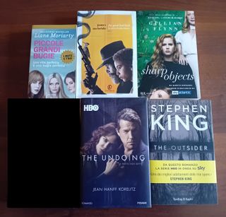 Vendo tutti questi libri in un unico blocco. Come da foto, i titoli sono i seguenti: "Piccole grandi bugie" di Liane Moriarty; "The Undoing" di Jean Hanff Korelitz; "The Good Lord Bird - La storia di John Brown" di James Mcbride; "Sharp Objects" di Gillian Flynn; "The Outsider" di Stephen King