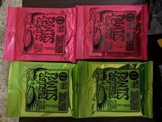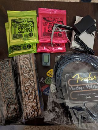 Vendo bundle contenente: 2 cinghie per chitarra/basso, 4 mute di corde Ernie Ball (due di tipo 10-46 Regular Slinky e due 9-42 Super Slinky), 1 jack Fender Vintage Voltage (da 6 metri), 1 capotasto, 1 alimentarore 9v (per pedali effetto), 1 accordatore Lote que incluye: 2 correas para guitarra/bajo, 4 juegos de cuerdas Ernie Ball (dos 10-46 Regular Slinky y dos 9-42 Super Slinky), 1 cable jack Fender Vintage Voltage (6 metros), 1 cejilla, 1 alimentador de 9 V (para pedales de efecto), 1 afinador digital con pinza (pila no incluida) y 6 púas Alice de distintos grosores. Productos en condiciones perfectas, como nuevos, nunca usados.