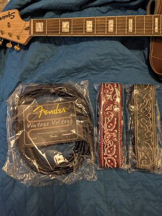 Set di accessori per chitarra. - Cavo Fender Vintage Voltage Premium Instrument Cable da 6 metri. - Due cinghie per chitarra con fantasia Paisley, una rossa e una nera.