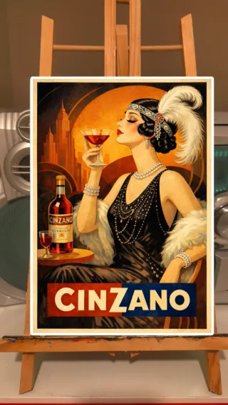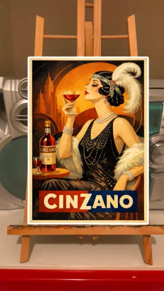 Poster in formato A3 con un'elegante illustrazione in stile Art Déco. - Raffigura una donna con un cocktail e una bottiglia di Cinzano. - Stile vintage ispirato agli anni '20. - Ideale per gli amanti del design retrò e del marchio Cinzano.
