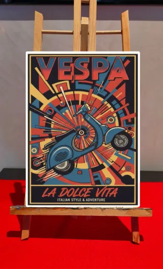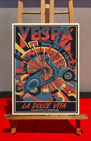 Poster in formato A3 con un design ispirato alla Vespa e al tema La Dolce Vita. - Stampa di alta qualità. - Grafica vibrante con colori accesi. - Tema Italian Style & Adventure.