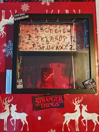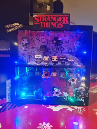 Espositore tematico di Stranger Things, ideale per collezionisti. Include luci LED per un'atmosfera speciale. (Senza batterie) - Design ispirato alla serie. - Luci LED integrate. - Include poster di Stranger Things da attaccare in alto. - Cartello Castle Byers e Benvenuti tutti gli amici.
