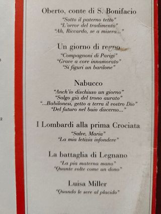 LP di ENRICO CARUSO,19 OPERE: 1)GIUSEPPE VERDI Questa o quella 2)Celeste Aida 3)ARRIGO BOITO Dai campi, dai prati 4)Giunto sul passo estremo 5)JULES MASSENET Chiudo gli occhi 6)PIETRO MASCAGNI Apri la tua finestra 7)O lola, ch'ai di latti la cammisa 8)RUGGIERO LEONCAVALLO Recitar - vesti la giubba 9)GIACOMO PUCCINI E lucevan le stelle 10)UMBERTO GIORDANO Amor ti vieta 11)GAETANO DONIZETTI Una furtiva lagrima 12)AMILCARE PONCHIELLI Cielo e mar 13)GEORGES BIZET Mi par d'udir ancora 14) FRANCESCO CILEA No, più nobile 15)FRANCESCO PAOLO TOSTI La mia canzone 16)LUIGI DENZA Luna fedel 17) Non t'amo più 18)Un bacio ancora 19)Mattinata