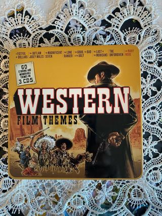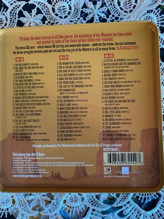 Box set di colonne sonore di film western. - 60 temi musicali. - Include temi da A Fistful of Dollars, The Outlaw Josey Wales, The Magnificent Seven, The Lone Ranger, The Good, the Bad and the Ugly, The Last of the Mohicans, The Unforgiven e molti altri. - 3 CD inclusi. e scatola originale