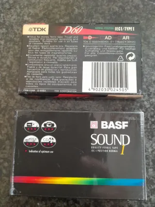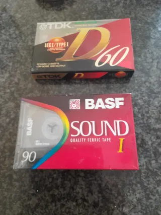 Vendesi due cassette audio vergini per registrazioni. - Una TDK D60, Dynamic Cassette, Low Noise High Output, Type I. - Una BASF Sound I, Quality Ferric Tape, durata 90 minuti.