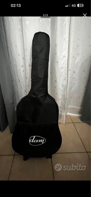 Custodia per chitarra marca Dam, colore nero. Manaca una corda - Logo Dam bianco sul davanti. - Custodia morbida per chitarra.