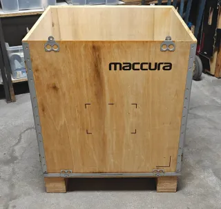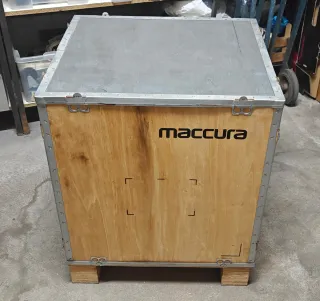Robusto contenitore in legno con rinforzi metallici, ideale per trasporto o stoccaggio. - Struttura in legno. - Bordi e angoli rinforzati in metallo. - Chiusure a scatto.