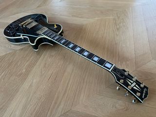 Epiphone Les Paul Custom LQ del 2005, la chitarra non è nuova ma è in buone condizioni, ha i suoi vent'anni e quindi il suo relic naturale, segni d'uso e ingiallimento della vernice. Non presenta rotture o riparazioni e i tasti non hanno segni né usura. Tastiera tipo open book di tipo Gibson e manico tipo Gibson. Finitura nitro, tastiera in ebano, ponticello in osso, elettronica con potenziometri CTS, condensatori Orange Drop, potenziometri push-pull per convertire le casse in single, selettore di casse e jack Switchcraft. Casse Epiphone 57 Classic. La chitarra suona e si suona molto bene. Recentemente revisionata e regolata da liutaio.
