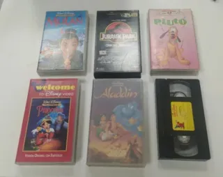 Collezione di sei film classici Disney in formato VHS. 5€=unità 15€=tutti - Mulan - Jurassic Park - Plutone - Pinocchio - Aladdin - Un nastro senza titolo visibile