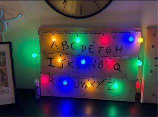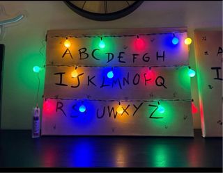 Quadro-lampada, realizzato a mano, riproduce una delle scene più iconiche di Stranger Things: la famosa parete con l'alfabeto e le luci natalizie utilizzate da Joyce per comunicare con il Sottosopra. lettere irregolari dipinte a pennello, l'effetto della carta da parati vintage con motivi floreali della casa dei Byers e le lettere R - U - N evidenziate in rosso. Le luci LED colorate sono gia installate sul quadro e funzionano tramite batterie (non incluse) Le foto dell'annuncio sono dimostrative e mostrano lavori gia realizzati, numerati e firmati. I quadri verranno prodotti solo dopo il pagamento. 30x40 cavalletto non incluso