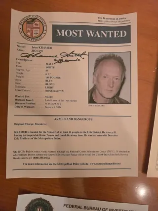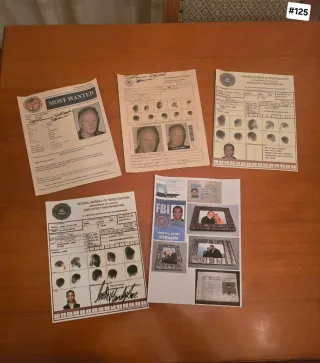 JIGSAW: Set di 5 documenti originali dell'FBI, tra cui un Most Wanted e schede di impronte digitali. • Documento Most Wanted con foto, Poster Most Wanted di John Kramer, alias Jigsaw. Un pezzo da collezione per gli appassionati della saga. • Dettagli del personaggio: John Kramer, Jigsaw, • Descrizione fisica: Maschio, Bianco, 54 anni, 1.85m, 81kg, occhi blu, capelli biondi, carnagione chiara. • Mandato di cattura: Omicidio, emesso dalla giurisdizione del 13° distretto, • Data del mandato: 6 gennaio 2016. • Avviso: Armato e pericoloso • Scheda Federal Bureau of Investigation Employee Fingerprinting con impronte. • Altre 3 schede Fe