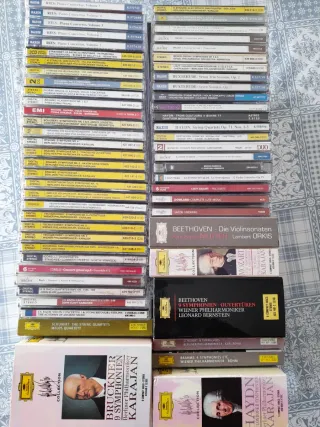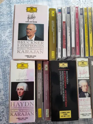 Lote inseparabile e non negoziabile di 103 CD di musica classica. Include opere di compositori come Beethoven, Brahms, Mozart, Haydn, Schubert, Vivaldi e altri. Vari interpreti e orchestre riconosciute come Karajan, Bernstein, Bohm... Ideale per collezionisti e amanti del genere. Dischi, scatole e libretti in eccellente stato.