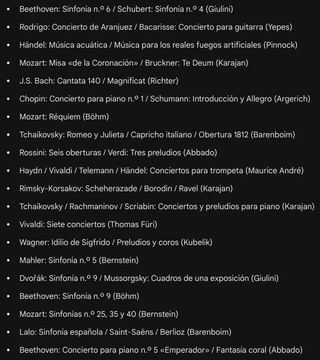 Titoli: -Beethoven: Sinfonia 6, 9 e Concerto 5. -Mozart: Requiem, Messa dell'Incoronazione, Sinfonia 25/35/40. -Bach: Cantata 140 e Magnificat. -Tchaikovsky: 1812, Romeo e Giulietta e Concerto per Piano. -Rodrigo: Concerto di Aranjuez. -Mahler: Sinfonia 5. -Chopin: Concerto per Piano 1. -Dvořák: Sinfonia 9 (Nuovo Mondo). -Händel: Musica per l'Acqua e Fuochi Reali. -Vivaldi: Sette Concerti. -Rossini: Sei Ouverture. -Schubert: Sinfonia 4. -Rimsky-Korsakov: Scheherazade. -Wagner: L'Idillio di Sigfrido. -Lalo: Sinfonia Spagnola.