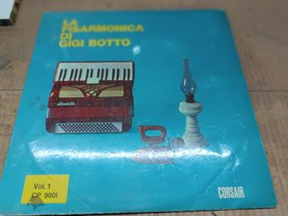 Disco in vinile 33 giri La Fisarmonica di Gigi Botto Vol. 1. - Copertina con fisarmonica, lampada a olio e ferro da stiro. - Etichetta Corsair. - Codice catalogo CP 9001.