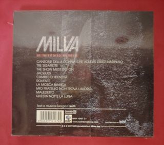 MILVA cd sigillato IN TERRITORIO NEMICO 2007 testi e musiche di Giorgio Faletti Canzone Della Donna Che Voleva Esser Marinaio 3:11 Tre Sigarette 4:11 The Show Must Go On 4:24 Jacques 4:27 Cambio D'Identità 4:09 Rovente 3:08 La Mosca Bianca 3:02 Mio Fratello Non Trova Lavoro 4:02 Maledetto 3:58 Questa Notte La Luna 1:26