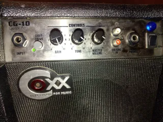 Amplificatore per chitarra elettrica CXX modello CG-10. - Ingresso per chitarra. - Controlli: Overdrive, Tone, Master Volume. - Ingresso CD/Line In. - Uscita cuffie. Tracolla per chitarra inclusa