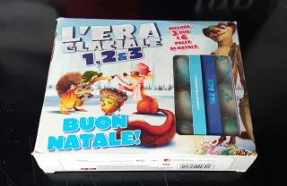 Cofanetto de L'era Glaciale con i primi tre film. Scatola esterna con qualche segno del tempo. - Include 3 DVD. - Contiene 6 palline decorative a tema Natale.