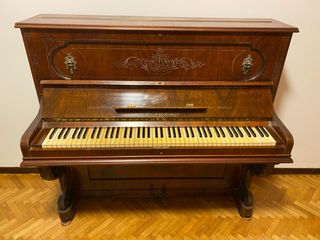 Elegante pianoforte verticale in legno massiccio, un vero pezzo d'antiquariato. - Finitura in legno scuro con intarsi decorativi. - Tastiera in avorio e ebano. - Decorazioni in ottone. - Piedi lavorati.