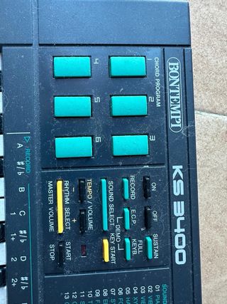 Tastiera elettronica Bontempi KS 3400 con 61 tasti. - Funzione Chord Program. - Sound Select con diverse voci. - Rhythm Bank con vari stili musicali. - Master Volume e Tempo/Volume regolabili. - Pulsanti Record, EGP, Key Start, Sustain, Stop e Start.