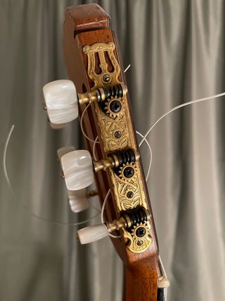 Guitarra spagnola del marchio M. G. Contreras. Anni 60. Questa chitarra spagnola è stata costruita dal maestro liutaio Manuel Contreras, uno dei migliori maestri della leggendaria casa José Ramírez che ha dato tanti grandi maestri artigiani. Dopo tre anni come maestro in quella casa di chitarre, ha deciso di intraprendere una strada propria e aprire il suo laboratorio in Calle Mayor nº80, dove hanno sfilato innumerevoli chitarristi e concertisti da tutto il mondo che richiedevano e ammiravano le chitarre di questo maestro liutaio. Principalmente un costruttore di chitarre classiche.